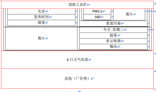 针对今日天气信息中主要包含的内容进行分析可知:可以将城市名称、发布时间、湿度信息等独立放置,然后将PM2.5的信息以及下方的今日天气信息块分别放到两个布局中,见下图所示。