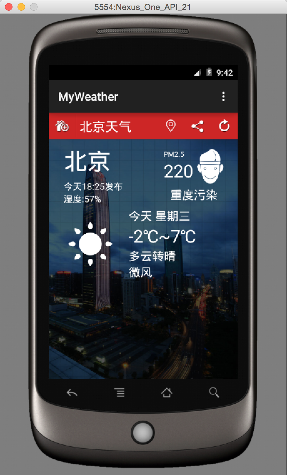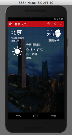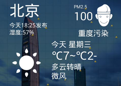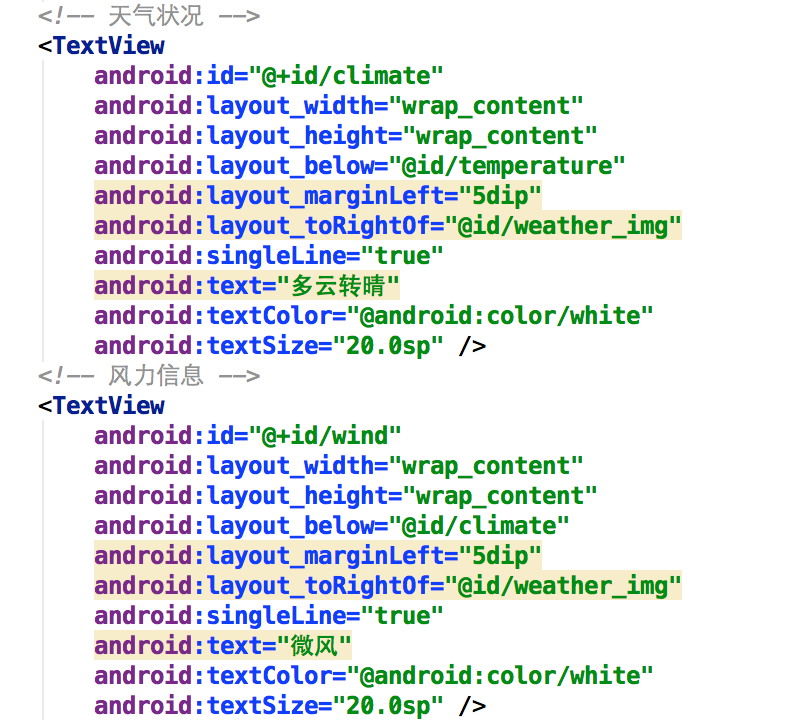 今日天气信息中包括天气状况图例、今日星期、温度情况、天气情况、风力信息等,这里放在了一个相对布局中。