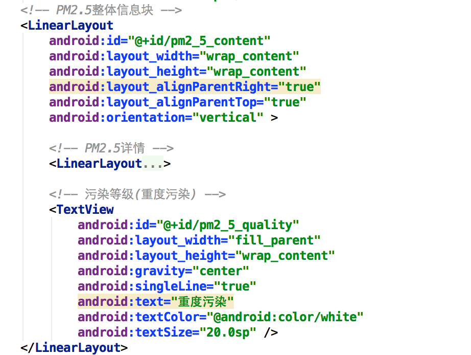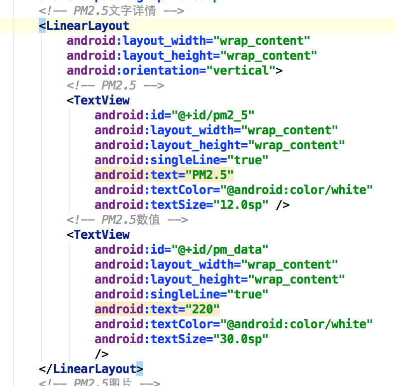 PM2.5信息块的布局方式如下所示。PM2.5详情单独放到了一个线性布局中。