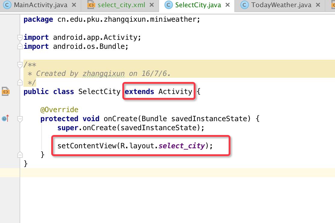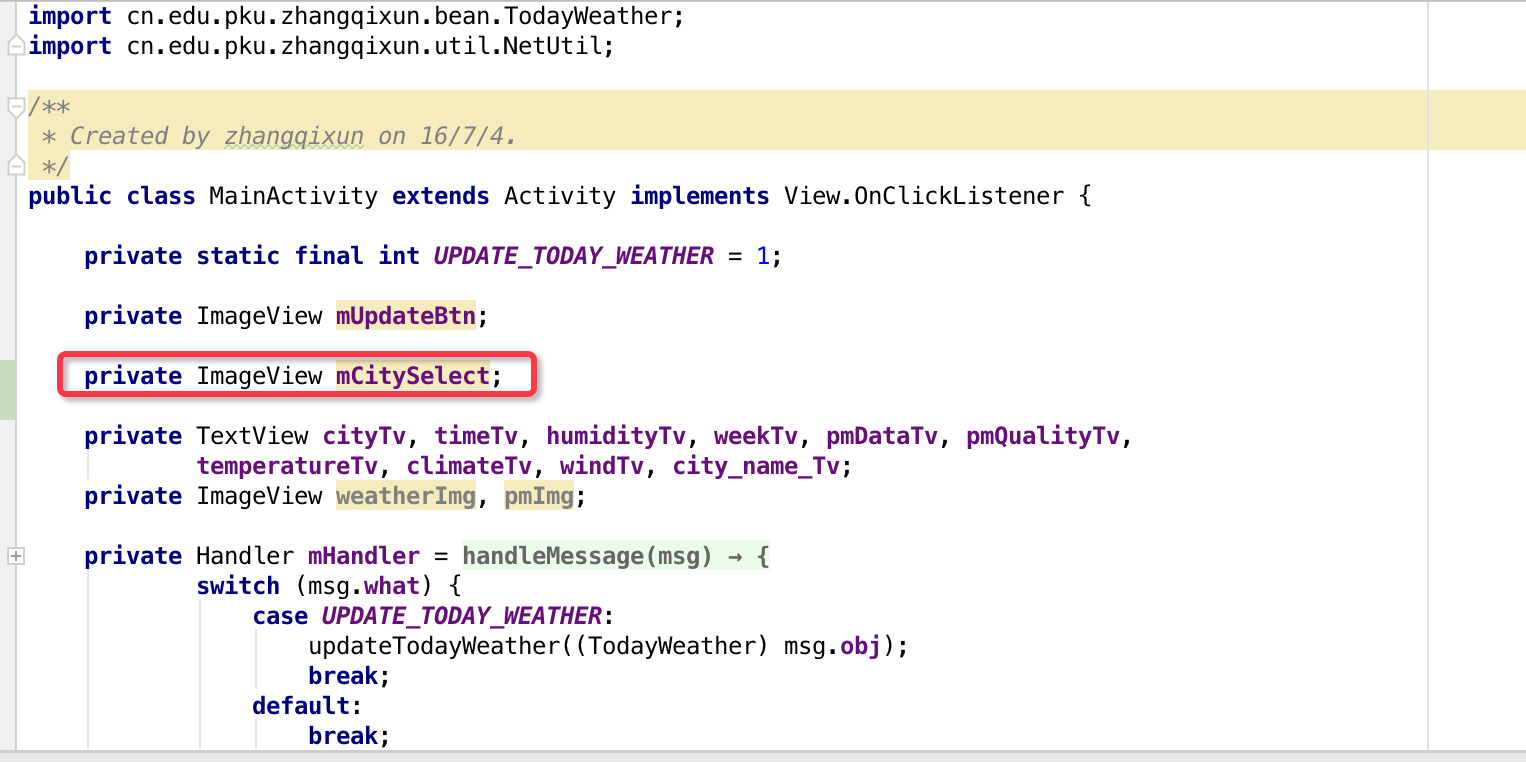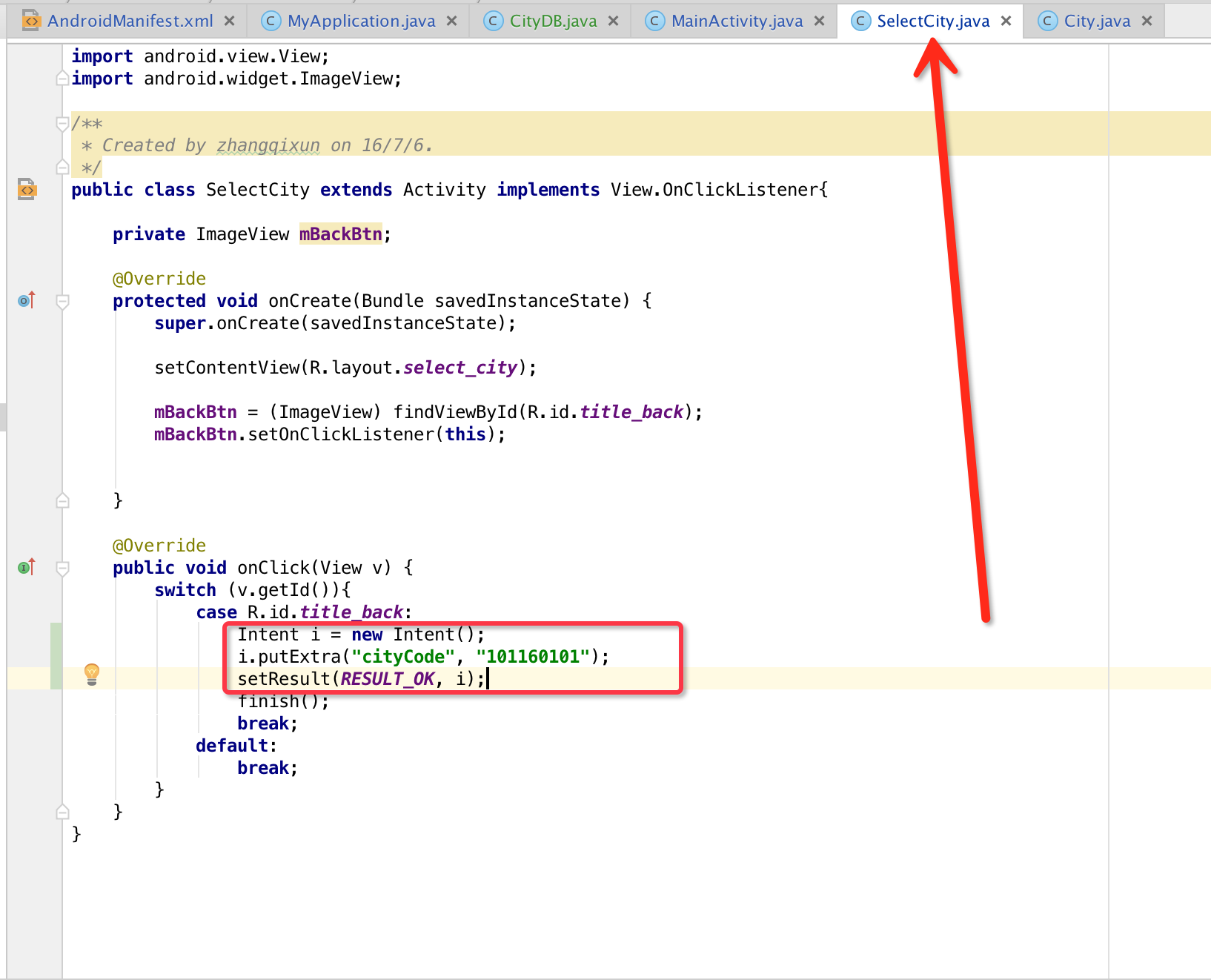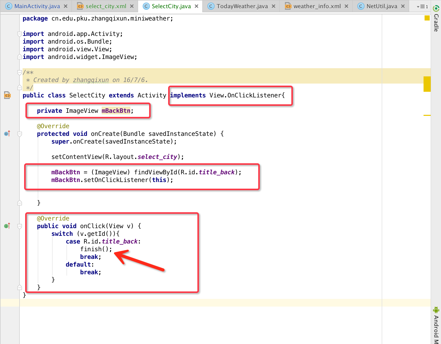 6.为选择城市界面的返回(ImageView)设置OnClick事件